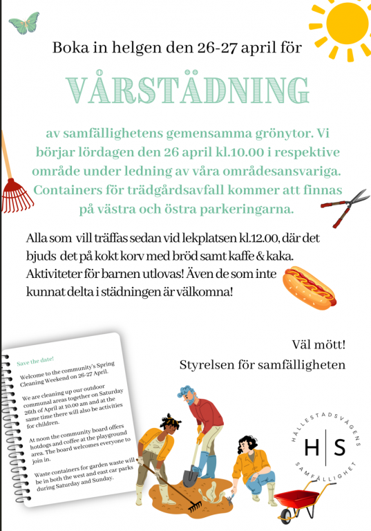 Välkomna att dela gemenskapen och hjälpa varandra att vårstäda i området den 26-27 april.